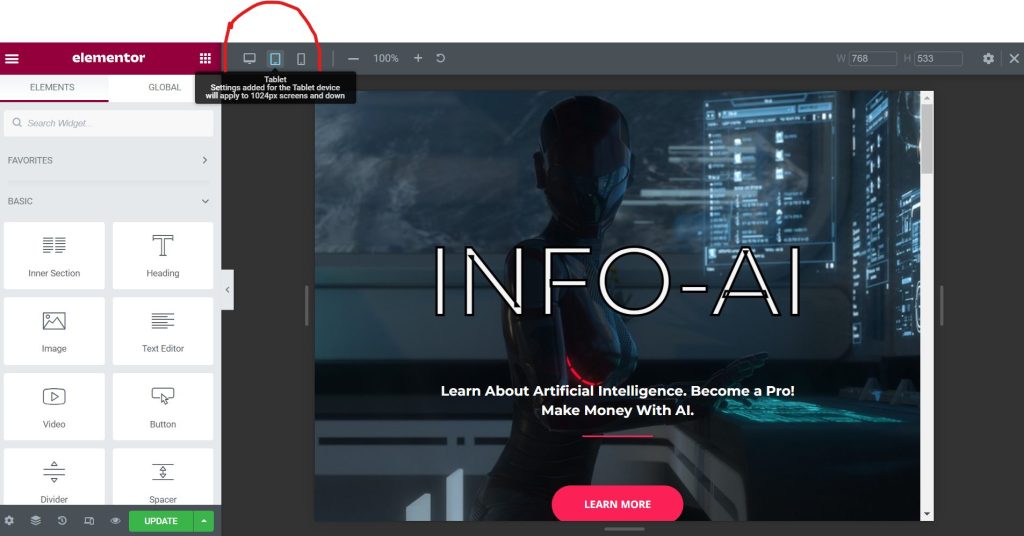 If you are using an eCommerce website builder like WordPress, there are inbuilt UX features that make UX design easier. Here’s the UX design feature for WordPress (elementor WordPress plugin) showing how the site looks on different devices.